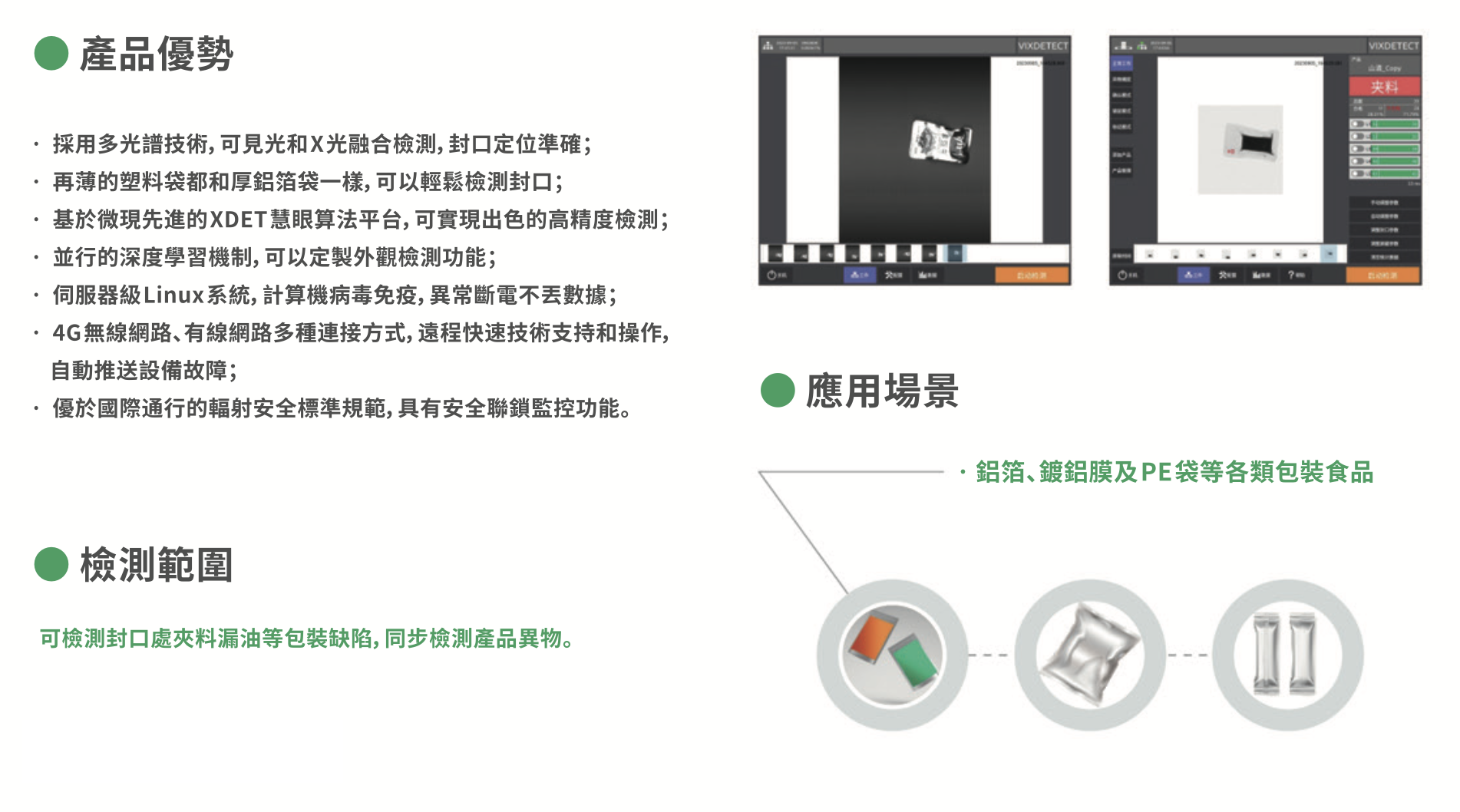 基於X射線、可見光、近紅外線等光譜的物理特徵,對產品表面污漬及封夾、內部缺陷及異物、新鮮度等缺陷進行識別,有效解決各類具有挑戰性的食品生產品質問題。