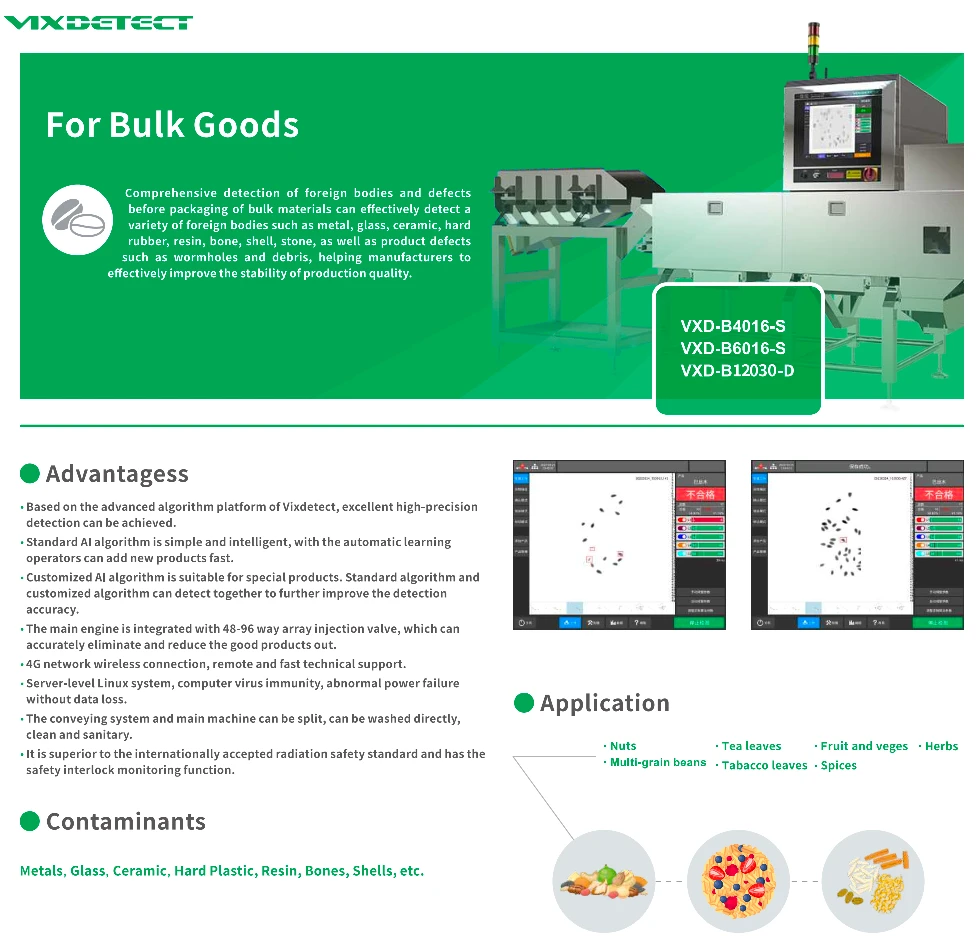 X 光可偵測散裝產品(包括堅果、水果、種子和食品)中的異物和缺陷。其他收穫物,檢出率高,浪費率低。